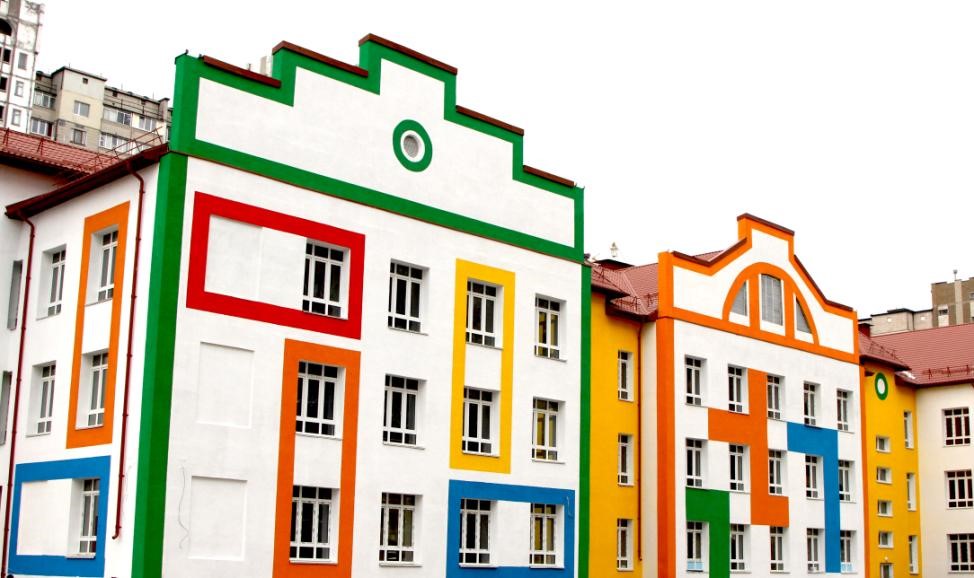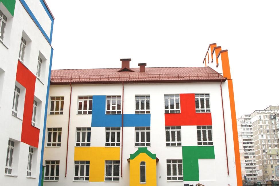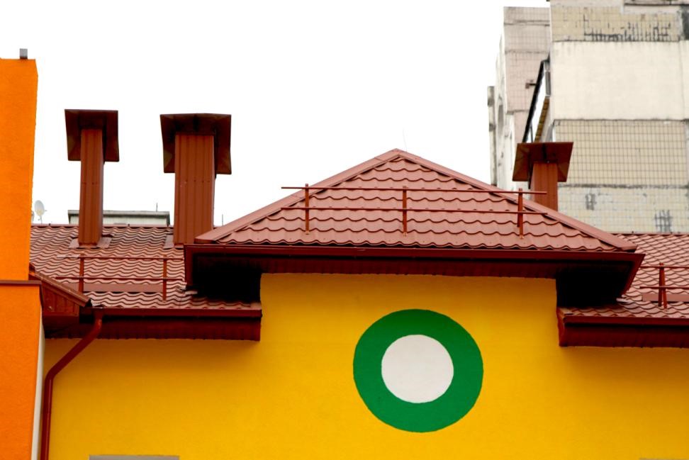 Детский сад. Киев, ул. ВишняковскаяМеталлочерепицы ATLANTATM, RAL 8004, Arcelor Mittal 0.5 PEMAВодосточная система Bilka 125/90, RAL 8004, SSAB 0.6 GrenCoat RWS®